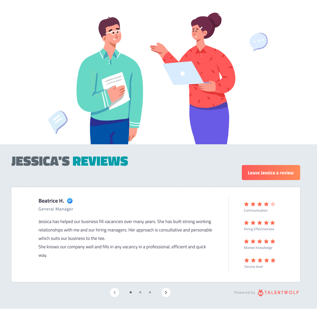 Maximize your website’s engagement by providing real-time dynamic reviews generated on Talentwolf by your past clients and candidates. Your visitors will be able to clearly identify that the reviews are authentic, having been provided and verified by an independent resource.